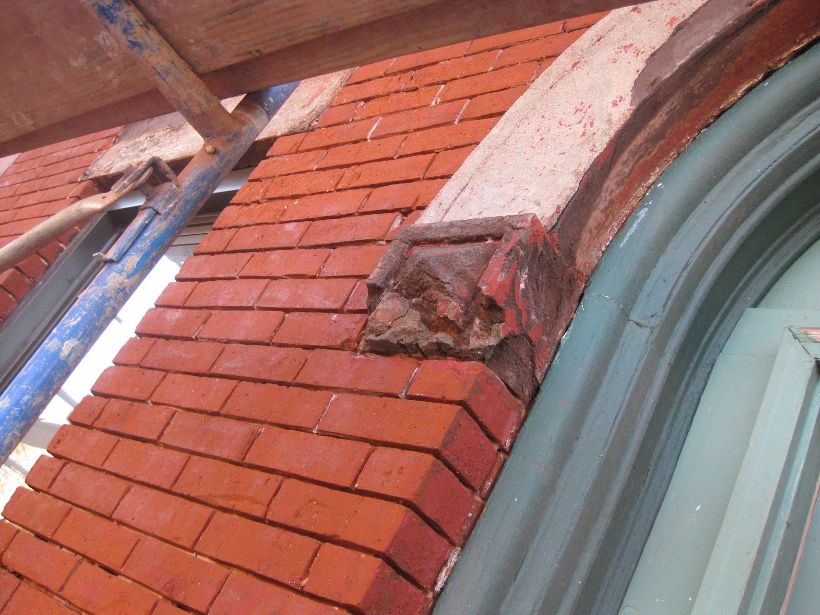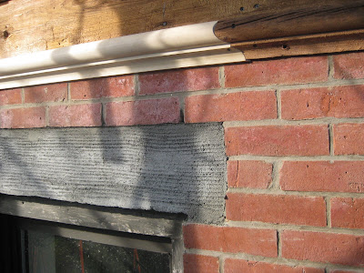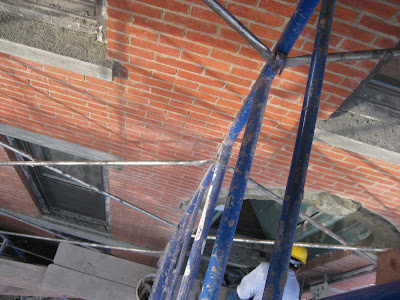 The bottom two pics show brickwork; they've removed all of the old grout from between the bricks and cleaned the paint off of the outside of the brick. They've also ground/chipped down the brownstone around the windows and doors, and are prepairing it for a base coat.