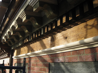 can be seen in the bottom picture (looking up). They have stripped the old paint from it and are replacing rotted and missing pieces. They are having the moldings cut to match.