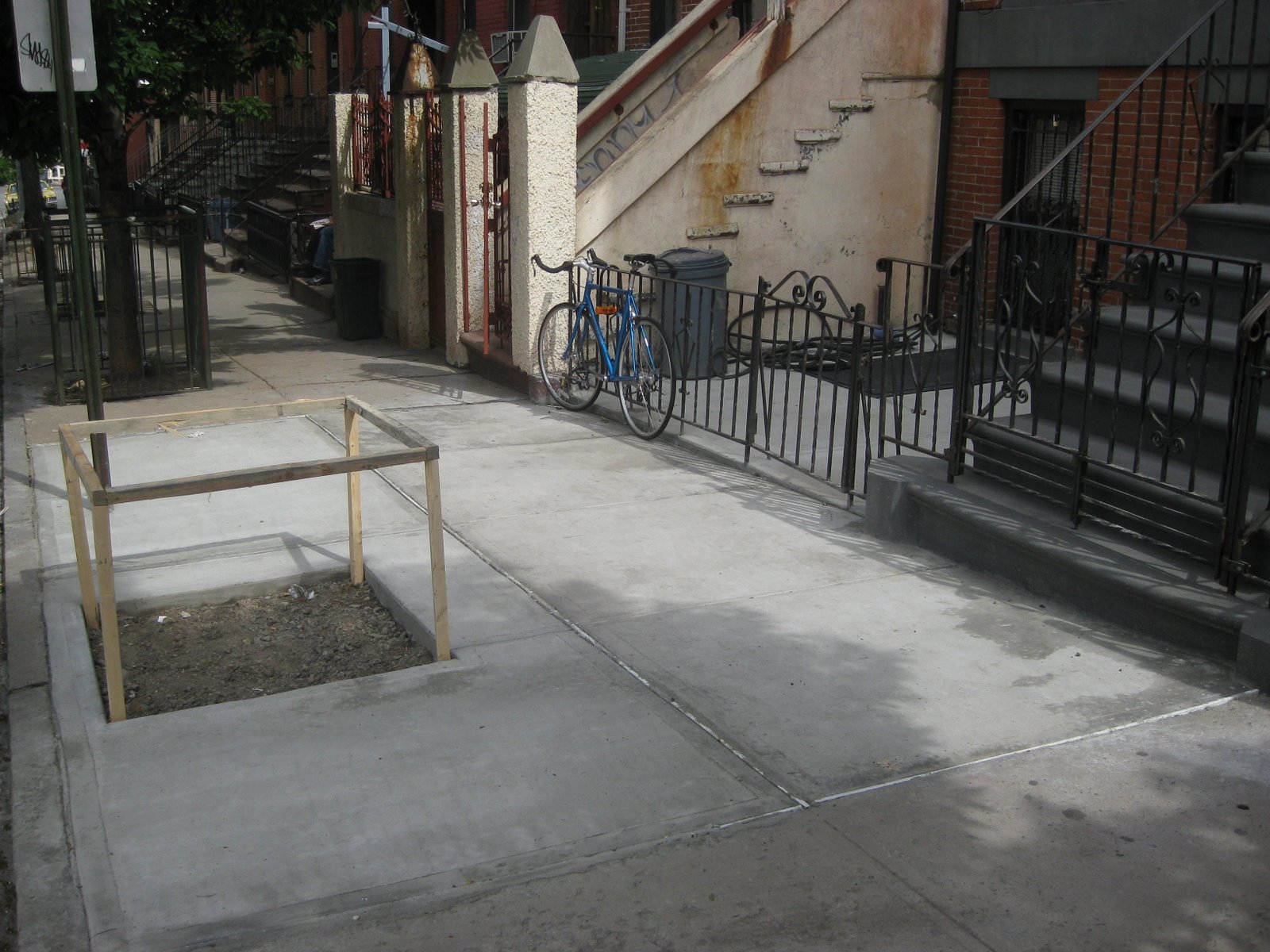 concrete has been jack-hammerd out and re-poured in the courtyard in front of our house and our sidewalk. check out the tree ring/square ready for a new tree!