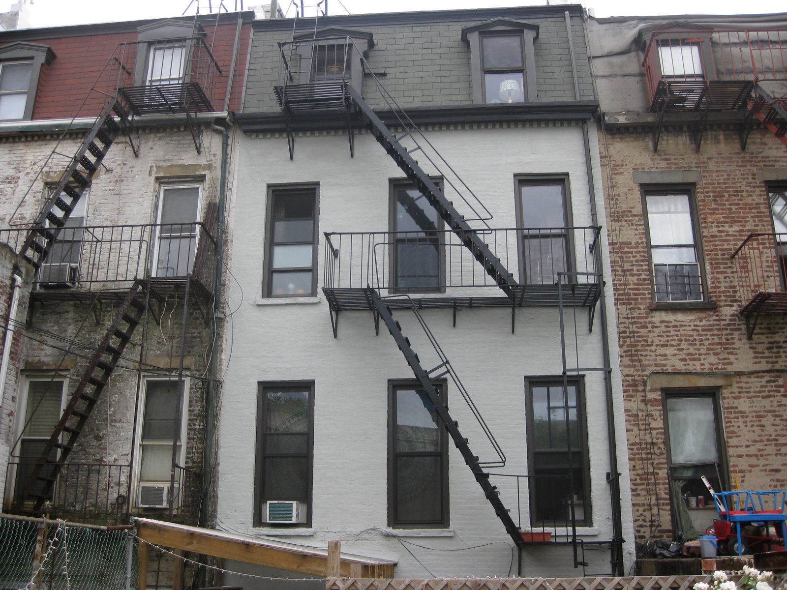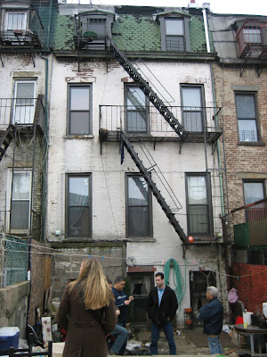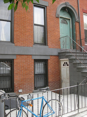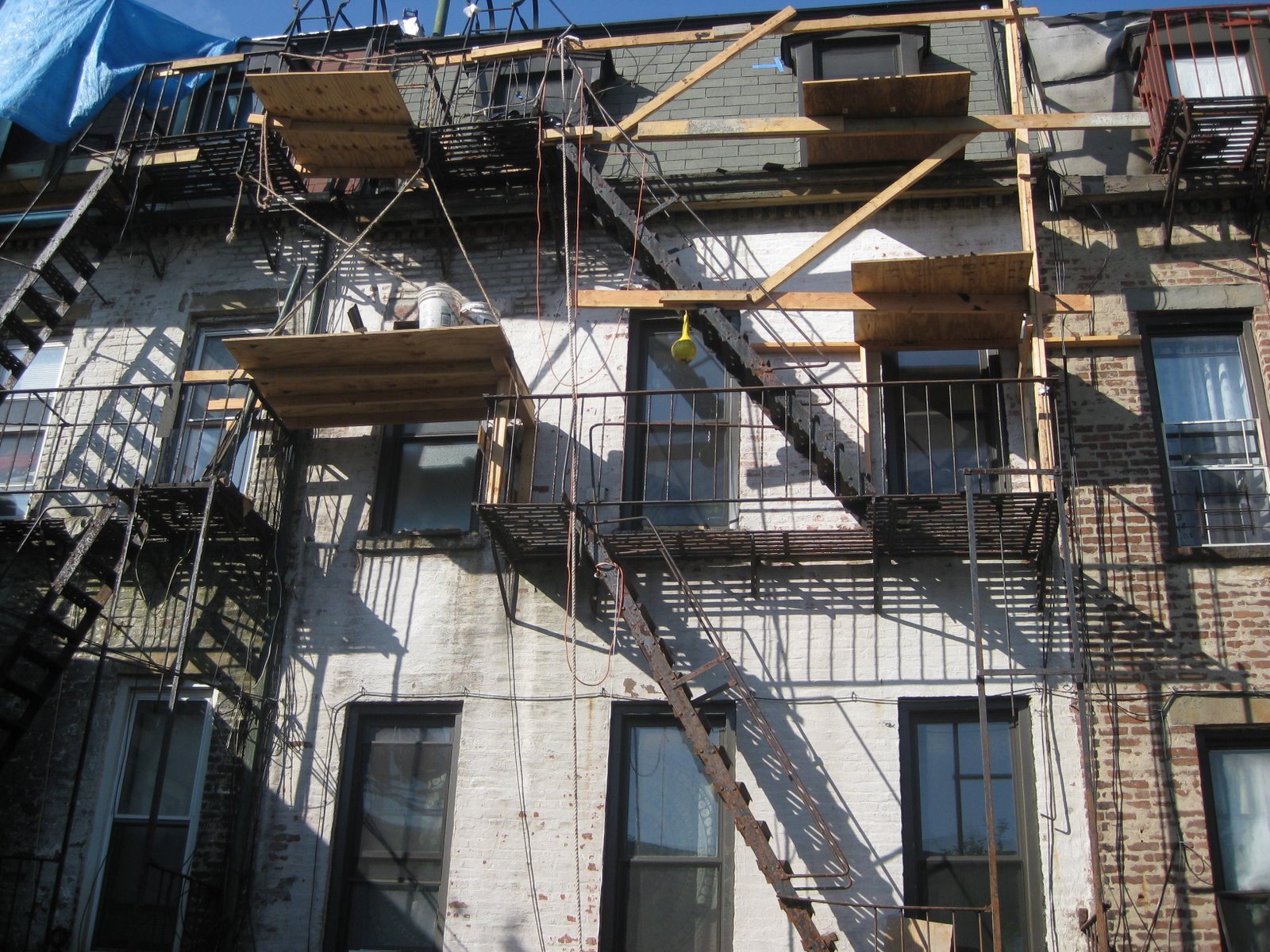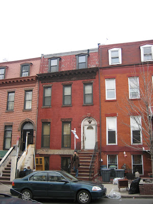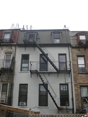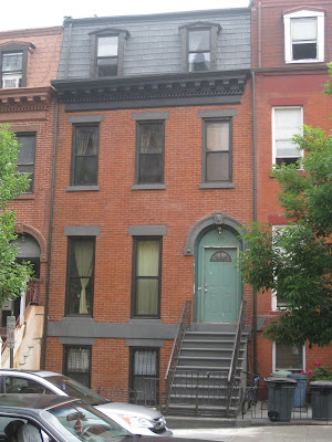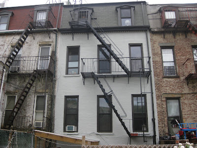 here's what the house looked like with the work crew's homemade scaffolding system in place. they replaced the asphalt shingles on the top level, fixing some leaks, and repaired and repainted the cornices and moulding (at the top). they also repaired some brick/mortar issues, and then repainted the whole house.