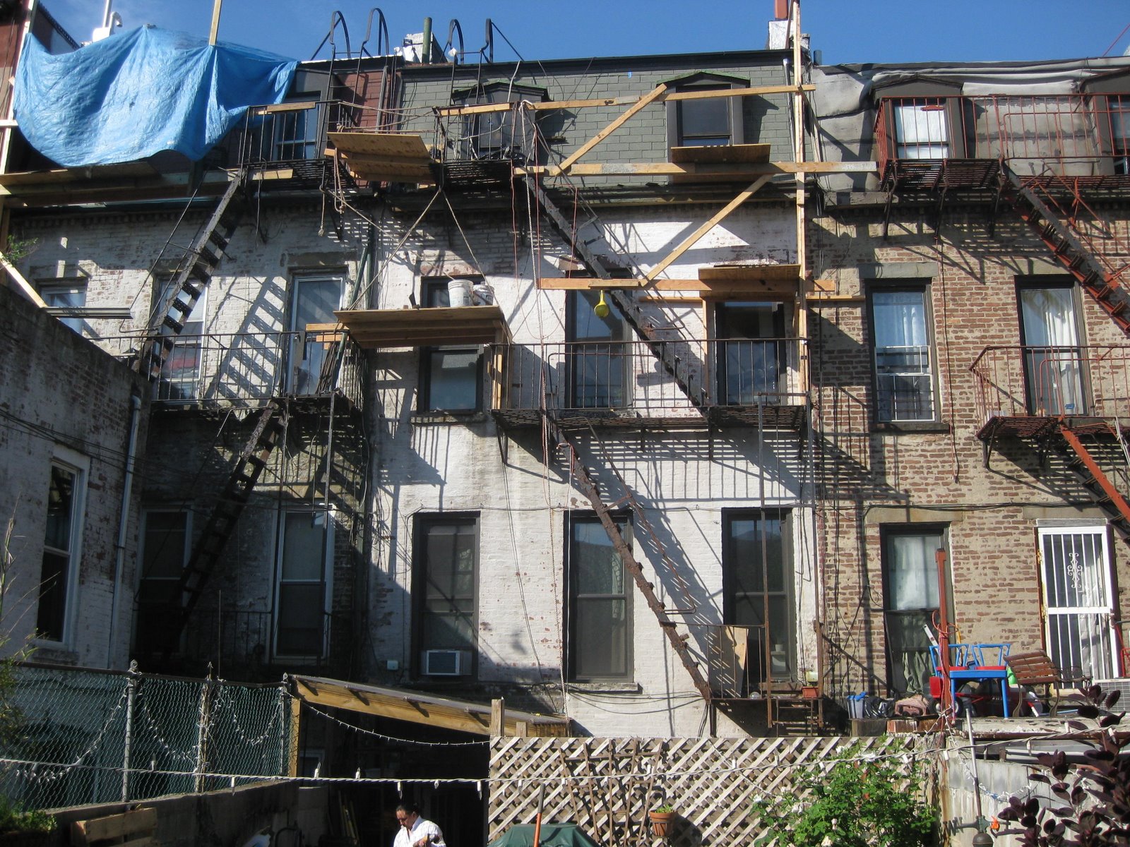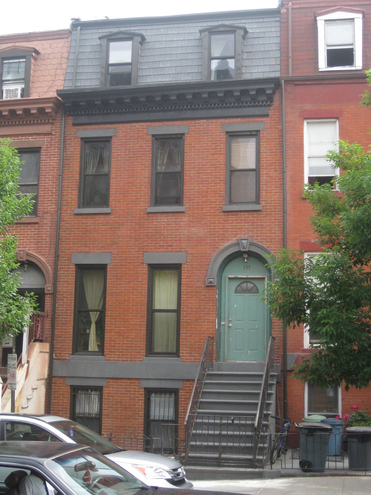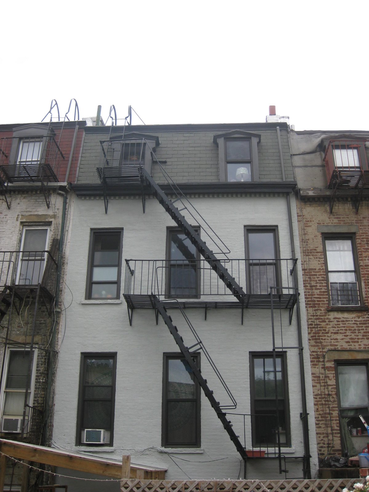 here's what the house looked like with the work crew's homemade scaffolding system in place. they replaced the asphalt shingles on the top level, fixing some leaks, and repaired and repainted the cornices and moulding (at the top). they also repaired some brick/mortar issues, and then repainted the whole house.