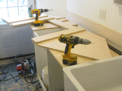 These are from 01/10, and show the installation of the cabinet/countertop configuration of the laundry room. We went back and forth on whether to tile this, and ultimately decided to go with cabinet-grade plywood and some polyurethane, with the idea that if we didn't like it, we could tile it later. First pic shows the countertop upside down with the cutouts for the toilet and the back door.