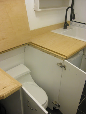 Here's the countertop on and the hinged lid above the toilet installed.Here's the sink installed and cabinet doors.
