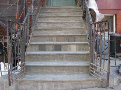 For reference, the first two are a couple of pics of the house, from 2007 when we bought it. We decided a few months ago to start contacting contractors and price out repairing the brick and brownstone, the concrete courtyard, and our sidewalk. After getting a recommendation from a neighbor, we found a great guy who started right away.