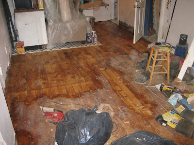 we just came through a big push on the fourth floor. here's some pics that capture the general feeling of those weeks. most of the fisher's apartment was piled in their kitchen area so we could refinish some parts of the floor that hadn't been done earlier.