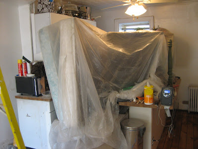 Here's more pics of the outside work. Our house is shrouded with a dust cloth, giving it a decidely funereal quality, except for the blue tarp on top...